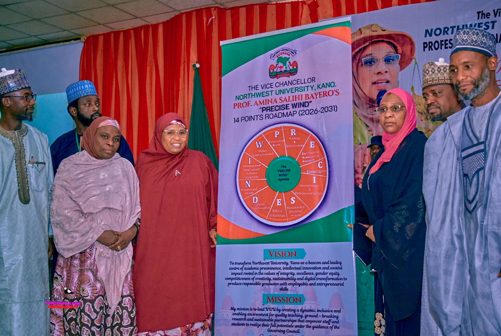 Northwest University Kano on Wednesday, 21st January 2026, recorded a major milestone with the formal unveiling of the 14-Point Agenda, christened PRECISE WIND, by the Vice-Chancellor, Professor Amina Salihi Bayero. The historic event took place at the Professor Hafiz Abubakar Auditorium, City Campus, and attracted a large turnout of staff and students.